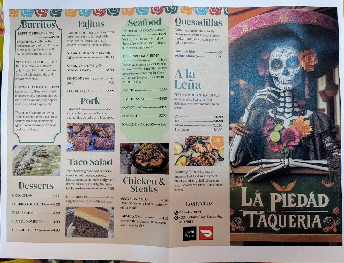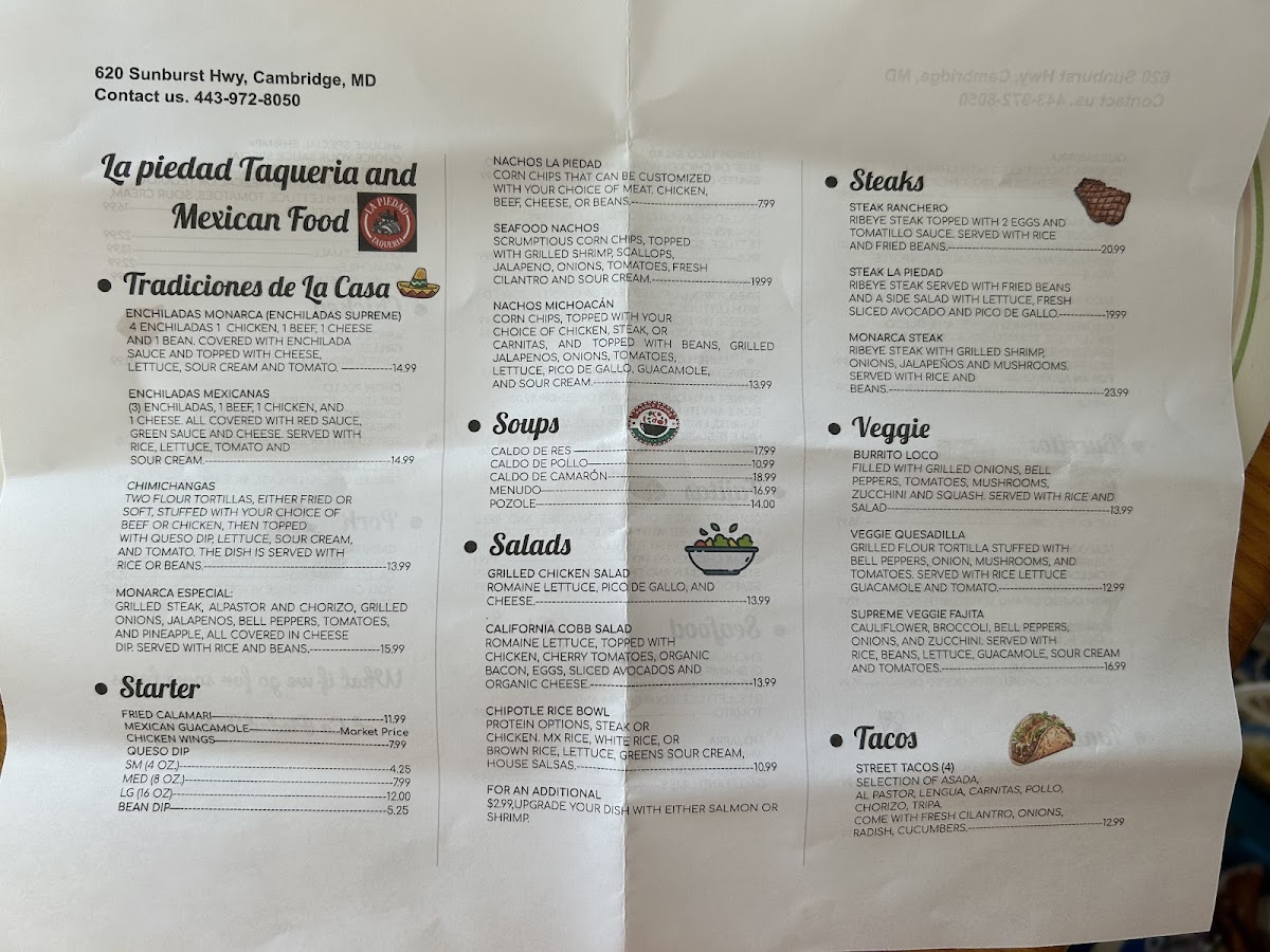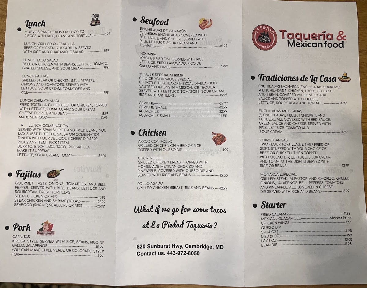 At La Piedad Taqueria, the flavors are as bold and vibrant as the Mexican traditions they honor. Nestled in Cambridge, MD, this spot is all about delivering authentic, mouthwatering dishes that bring a taste of Mexico right to your table. From sizzling tacos filled with your choice of savory meats to flavorful salsas that pack a punch, the menu is a celebration of classic and contemporary Mexican cuisine. Whether you're in the mood for something light like a fresh taco or craving a hearty dish, there's something for everyone. Each bite offers a perfect balance of spices, herbs, and rich flavors, making it clear that La Piedad Taqueria is where great food meets genuine Mexican cooking. So, if you’re looking for an unforgettable culinary experience, just dive right in and enjoy all the deliciousness this menu has to offer.